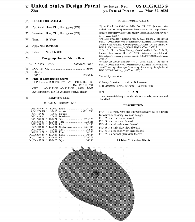 涉及名为Brush for animals的美国外观专利,专利号USD1020133S,2023年11月14日提交申请,2024年3月26日下证: