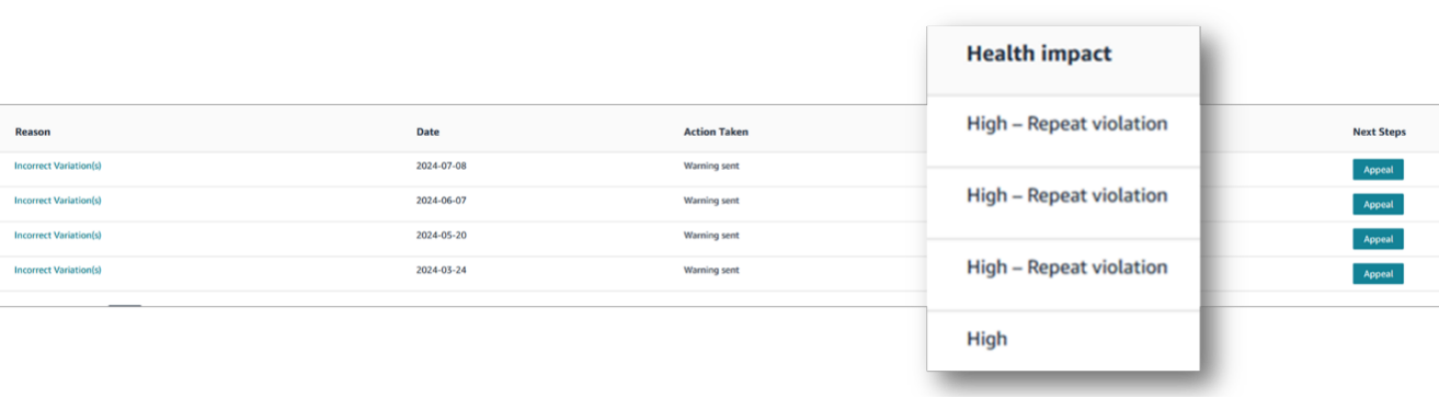 ▼重复违规行为将会在账户状况页面的“影响”栏中被标记