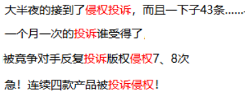 然而,知识产权侵权投诉又极其高发。大半夜收到43条侵权投诉、一个月被投诉一次、被竞对反复投诉七八次、连续几款产品被投诉侵权……这样的情况比比皆是。