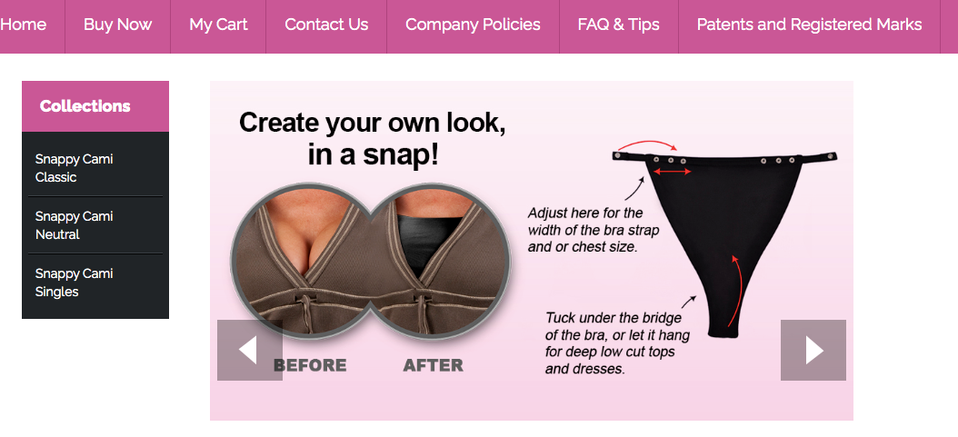 原告公司BraNovations, Inc是一家美国公司,是按扣式仿吊带背心的原创制造商,其强调不使用粘合点、吊袜带夹、细绳、纽扣和环扣或钩眼。拥有四项美国专利和多项已颁发和正在申请的国际专利。在世界各地制造和分销CLEAVA®和SNAPPYCAMI®仿吊带背心产品的业务,通过网站等进行销售。