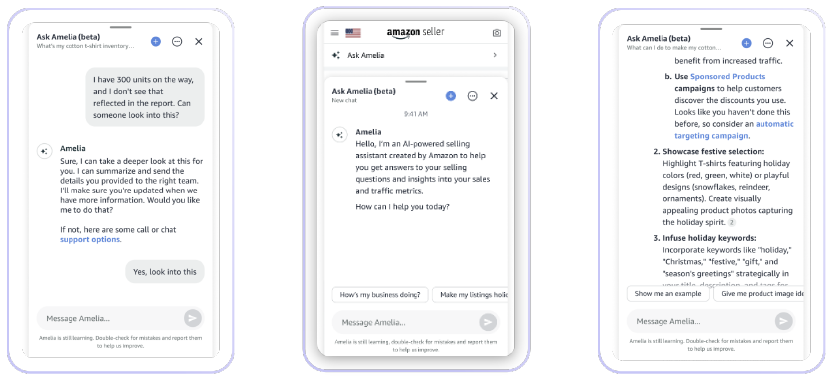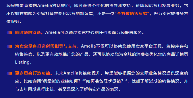 “随着时间的推移,卖家助手Amelia将能够提供更多的功能,处理更复杂的场景,提出更详细且可行的见解,致力于为卖家朋友们节省时间与精力,从而专注于开发优秀产品和满足客户需求。”