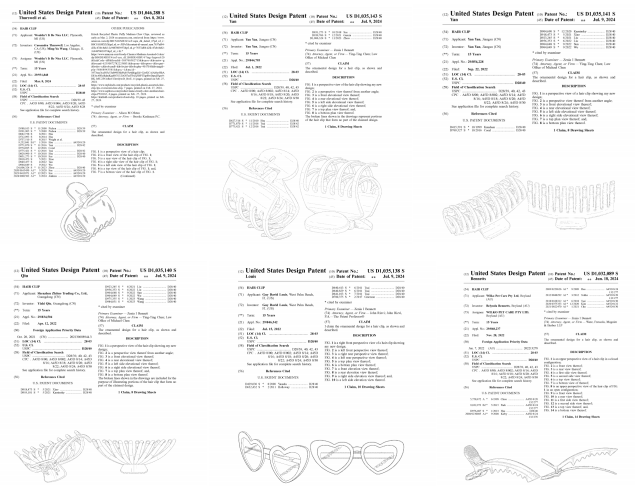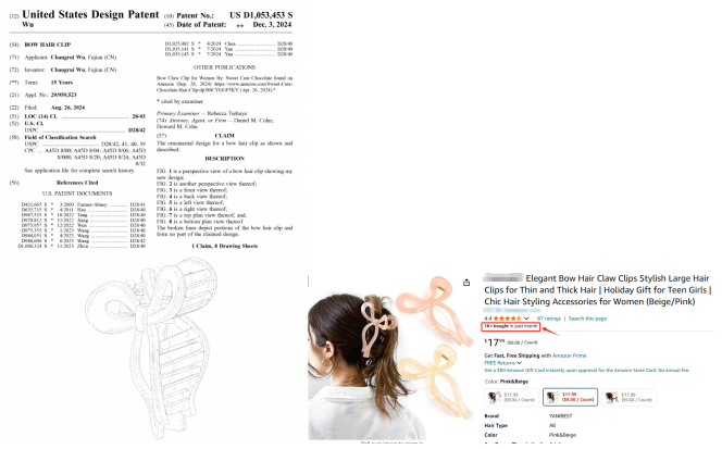 12月3日就有一款热门产品外观专利下证,专利名称Bow hair clip,专利号USD1053453S,2024年8月26日申请,亚马逊上有不少外观与之相似的产品在售,月销过百破千的都有:
