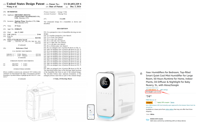 热销背后往往藏有侵权风险,加湿器也不例外。以下这款月销1K+的产品就在近期下证了美国外观专利,专利名称 Humidifier,专利号USD1053329S,2023年7月13日申请,2024年12月3日获得授权: