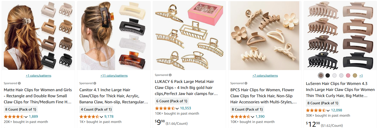 发夹在亚马逊上相当热销,在售listing多达20000+,其中有不少月销过千甚至破万。而且款式看着都大差不差,很容易让人忽视其侵权风险。