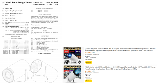 投影仪虽好卖但却藏有不小的专利侵权风险,12月17日就有一件外观专利下证,专利名称Projector,专利号USD1054470S,2023年3月31日申请: