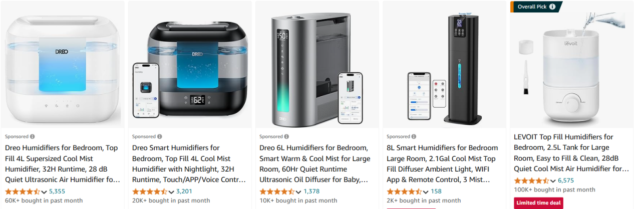 加湿器可以缓解室内空气干燥,很适合在秋冬季节使用,每年下半年都会迎来销售高峰。亚马逊上已有不少产品卖爆,月销过千甚至破万。