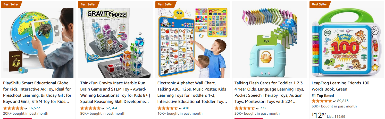 益智玩具是一种专门设计于培养儿童注意力、记忆力、以及问题解决能力的玩具,极受家长青睐。亚马逊上相关listing多达6W+,虽竞争激烈,但月销过千破万的产品不在少数,相当好卖。