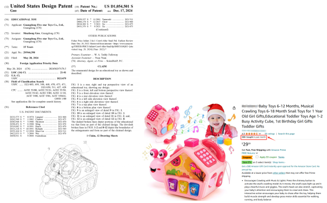 不少益智玩具已有专利,12月17日就有一件外观专利下证,专利名称Educational toy,专利号USD1054501S,2024年5月28日申请,外观与之高度相似的产品在亚马逊上月销500+: