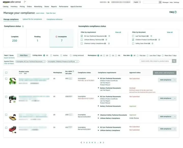 在运营过程中,您可以使用管理您的合规性(Manage Your Compliance,简称MYC)工具,帮助您上传合规性文件,全方位管理在架商品合规事项,及时解决合规问题,轻松简单地应对合规要求。