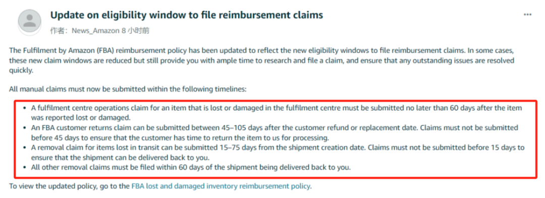 月16日,亚马逊美国站发布了一则公告,宣布更新其FBA物流赔偿政策,对提交索赔的资格期限进行了调整。