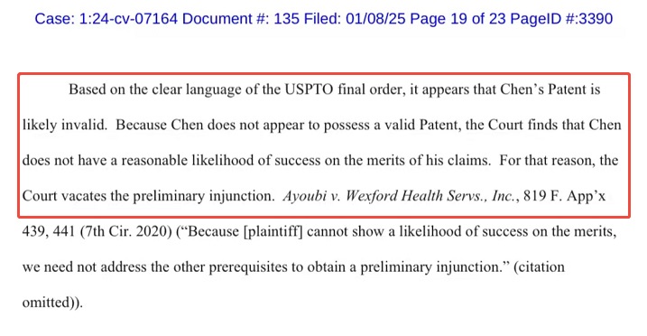 商标暴雷一直是卖家的坑,据不完全统计,2024年USPTO已发出涉及中国卖家的近5万件商标的处罚决定。而美国专利方面也开始爆雷,2024年10月2日,美国专利商标局(USPTO)宣布终止约3100项涉嫌欺诈性签名的专利申请。基于这些欺诈性签名,已授权的专利也不“安稳”,面临无效或不可实施的结果。已有联邦法院基于相关理由,认定原告专利无效,进而撤销了初步禁令。