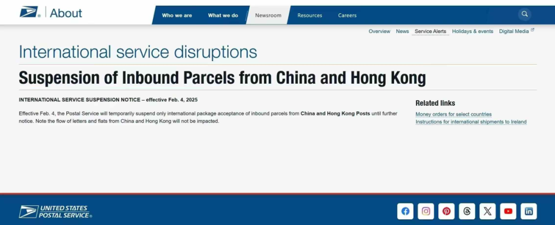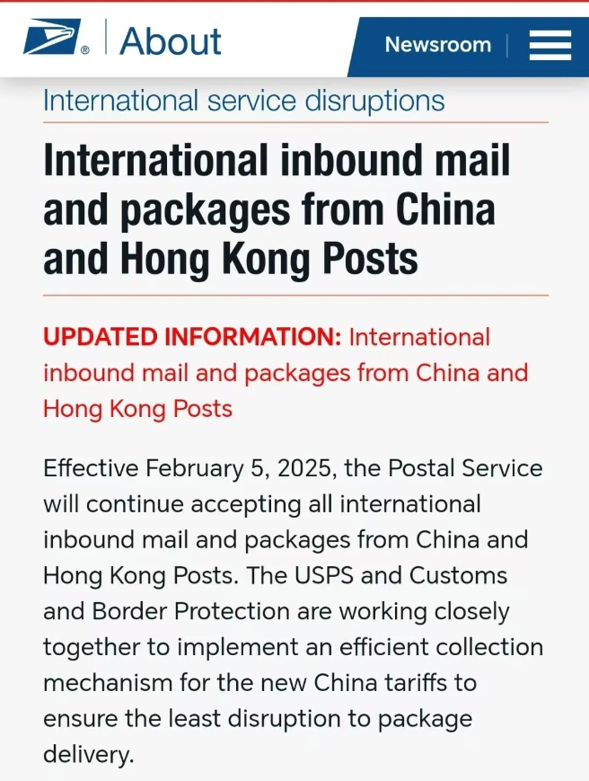 当地时间2月4号,美国邮政(USPS)发布公告称,将暂停接收来自美国大陆和中国香港的包裹。