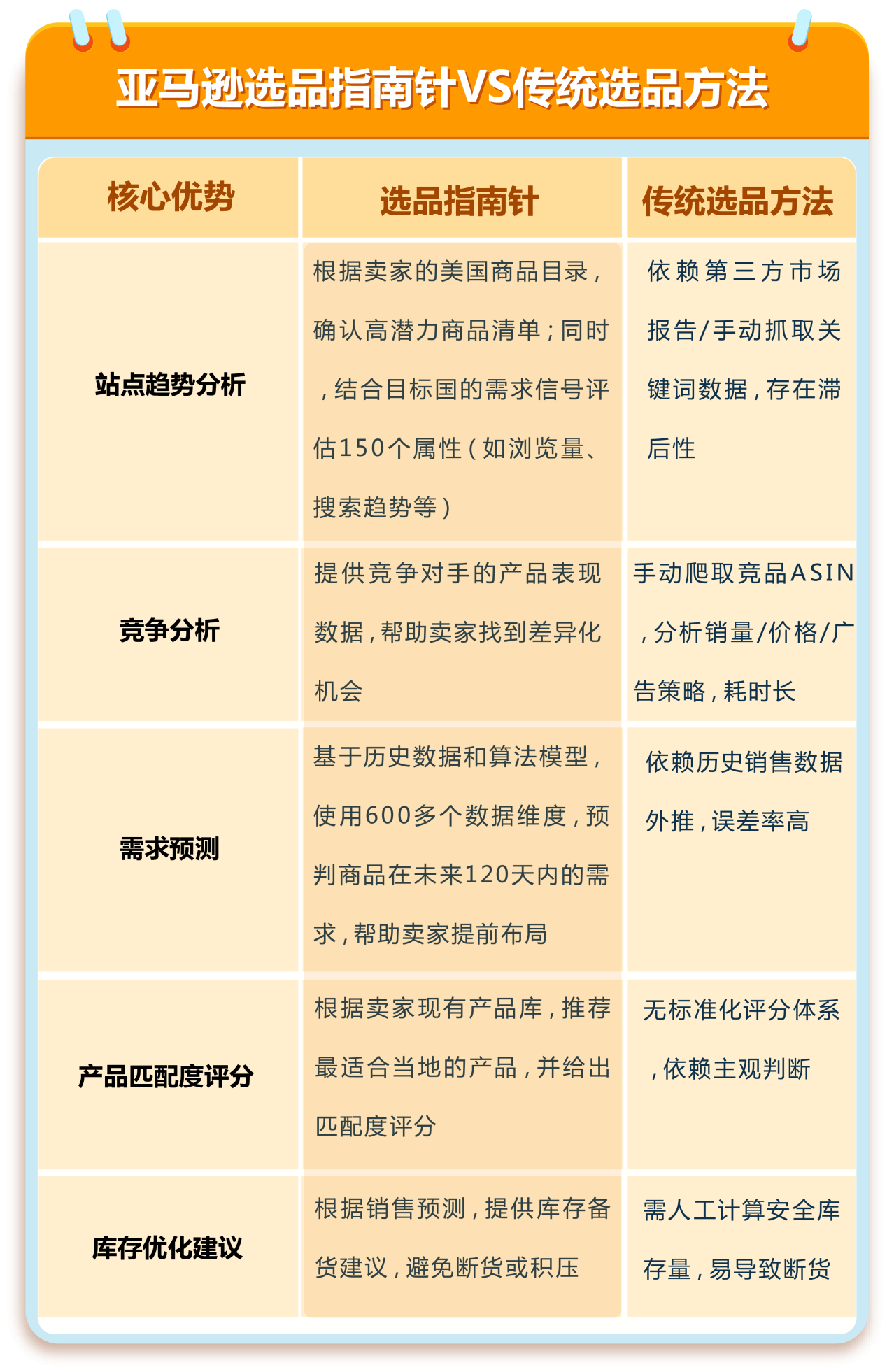 选品指南针工具是亚马逊为卖家定制的解决方案,基于卖家在主站点已有的产品类目,这套方案通过计算“机会分数”有针对性地为卖家推荐适合拓展的站点,并为卖家分析本站和跨国其他站点的高需求商品,客户的喜好以及不同类目下选品的比较。