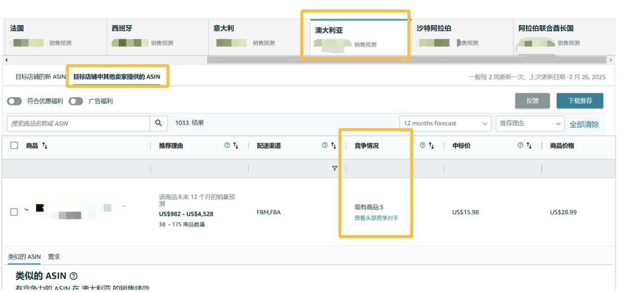 ● 然后切换到“目标店铺中其他卖家提供的ASIN”菜单下的“竞争情况”列,可以查看到目前澳洲站点已经在售卖此ASIN,以及相类似的ASIN