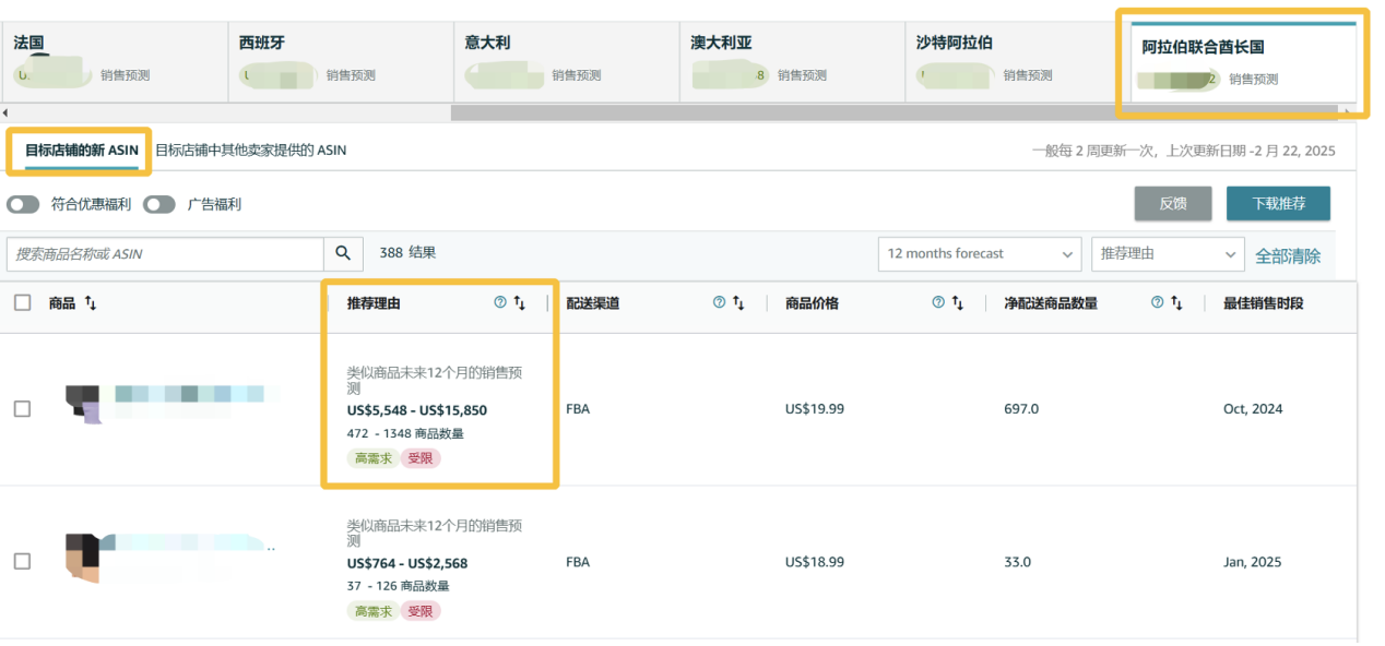● 在“目标店铺的新ASIN”菜单下的“推荐理由”列可以看到在美国站售卖的ASIN,目前在阿联酋站属于“高需求”产品,且可以了解相应的预计未来12个月的销售额;