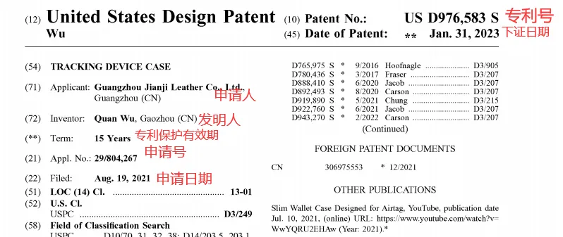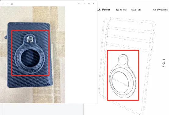 根据美国外观专利部分保护制度,实线表示保护,虚线则是不保护。比如下方专利保护的是实线部分的形状,若是产品的部分结构与该形状高度相似,即使钱包的外形不一样,也会有外观专利侵权风险。
