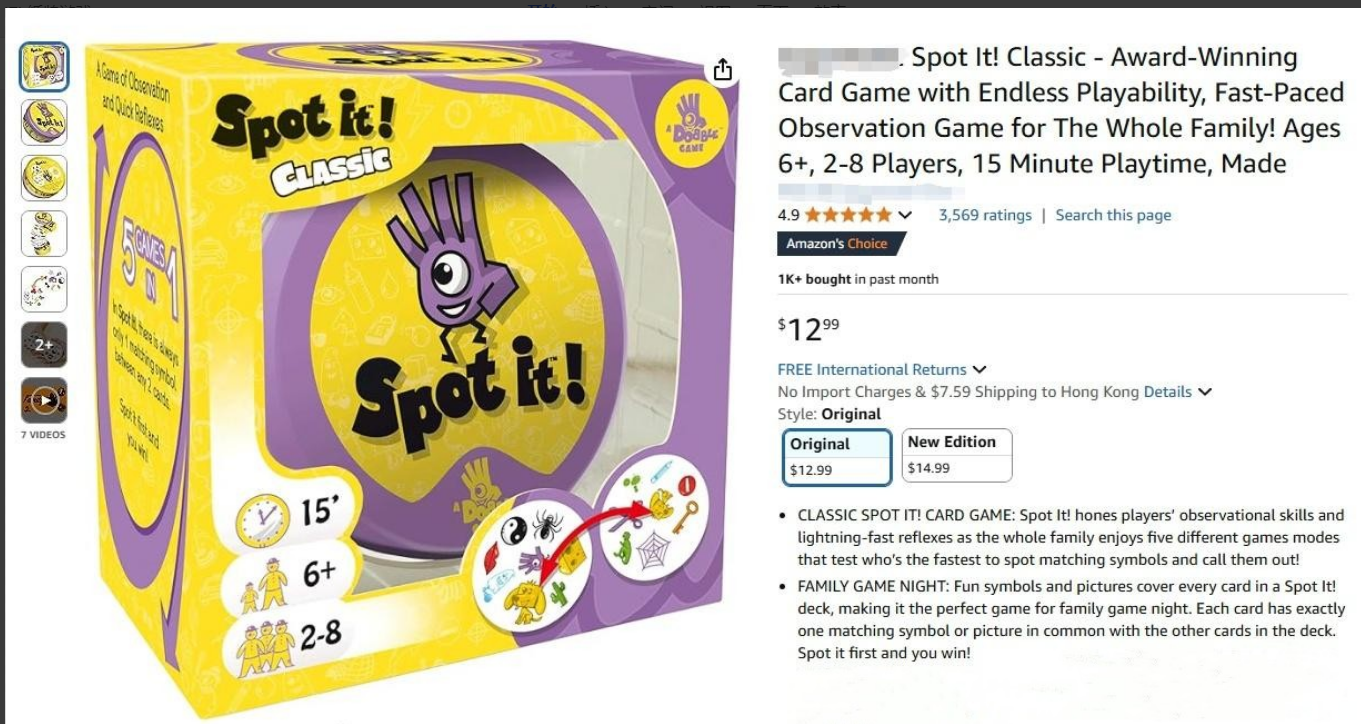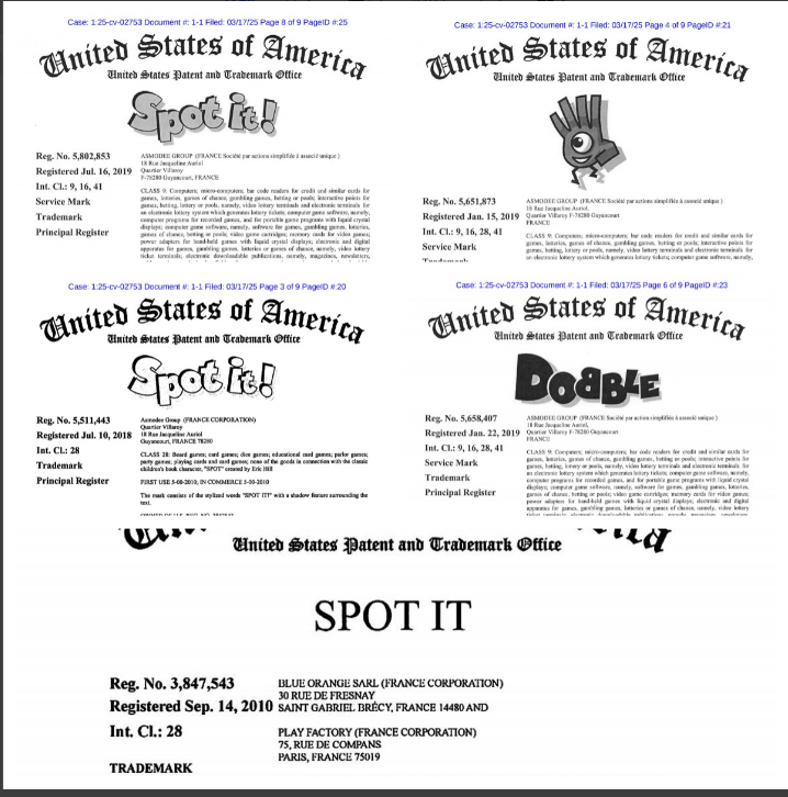 原告 ASMODEE 是一家法国公司,从事开发、营销、销售和分销 SPOT IT! 产品的业务。游戏 DOBBLE 最初于 2009 年发布,并已在美国以 SPOT IT! 品牌销售近十年。这是一款纸牌游戏,玩家必须在两张抽出的牌之间找到共同的符号。任何两张牌总是有一个且只有一个匹配的符号。DOBBLE 和 SPOT IT! 简单易学,深受各个年龄段消费者的欢迎。