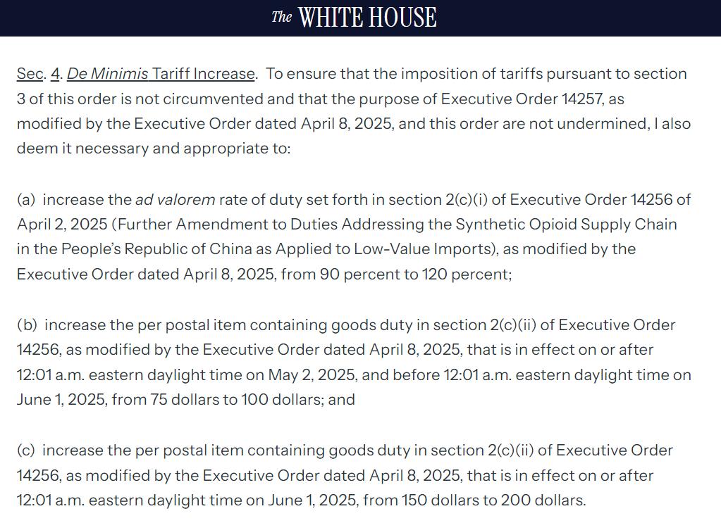 4月8日,美国白宫签署行政命令,针对中国电商平台的关税税率从30%飙升至90%,6月1日后每件包裹费用更将高达150美元。与此同时,5月2日起,所有中国产低值包裹将彻底失去免税资格。这一调整直接切断了Temu和SHEIN赖以生存的“小包直邮”模式——过去十年,这一模式让中国商品以极低成本直抵美国消费者手中,但如今关税成本已远超商品本身利润。