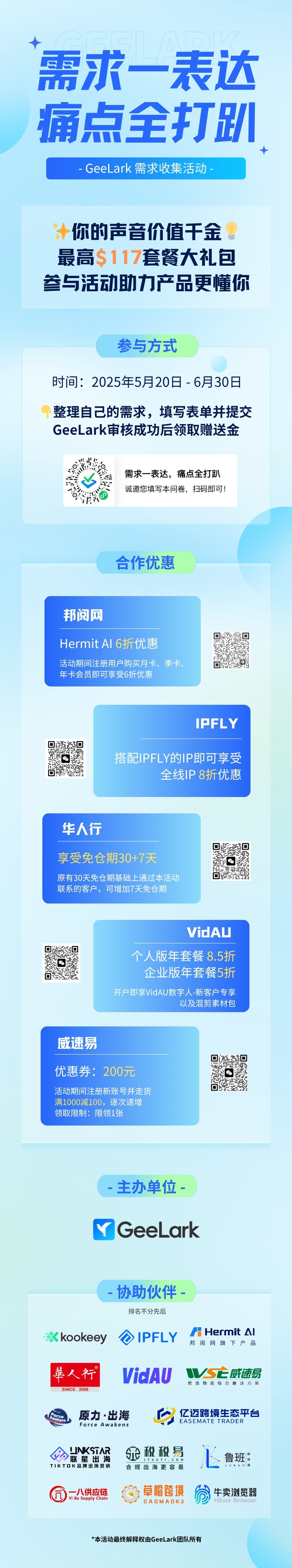 随着企业全球化需求激增,各种运营难题也随之浮现:多设备协作效率低下、社交媒体平台账号管理混乱、手工操作繁琐耗时等问题困扰着众多出海企业。 与此同时,云计算和5G技术的普及加速了企业"上云"的进程,市场对操作简单、成本低廉且合规可靠的数字化工具需求迫切。正是在这样的背景下,GeeLark 应运而生,专注于为跨境电商、短视频运营等领域提供解决方案。 为了更好地服务中国出海企业,助力跨境电商行业发展,GeeLark 特别推出"需求一表达,痛点全打趴"主题活动,诚邀各界参与,共同破解行业难题。 👉表单提交链接:https://wj.qq.com/s2/21898944/59fe/ 2025年5月20日 - 6月30日 💥填写需求/建议,审核有效后即可获得 $3 赠送金奖励 🏆优秀建议奖励组: 💡以及有着更多合作伙伴联动优惠,更多亮点等你解锁。❝