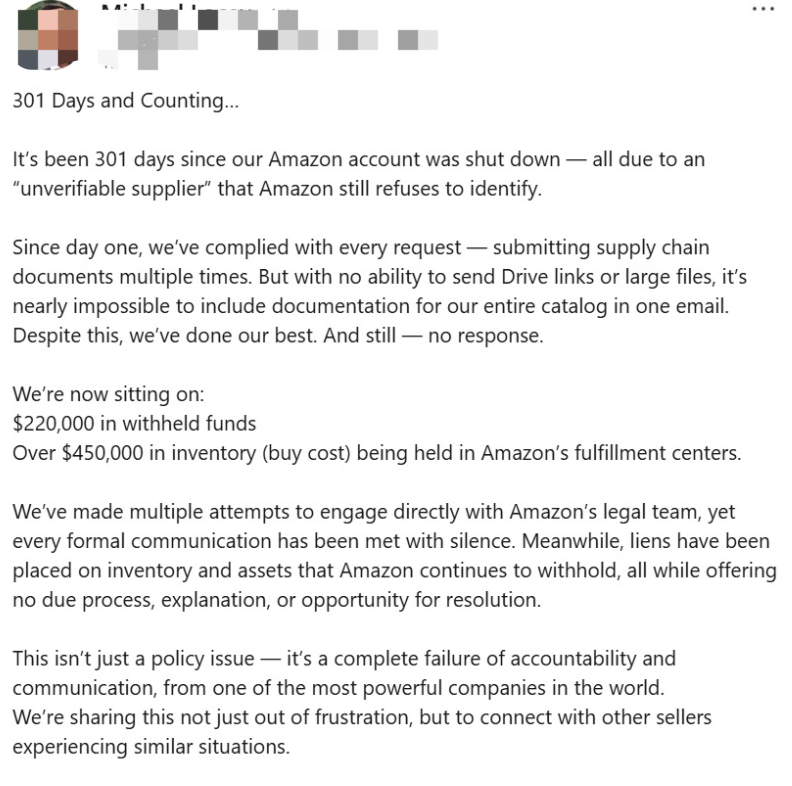 我们的亚马逊账户被关闭已经301天了——这一切都是因为一个“无法验证的供应商”,而亚马逊至今仍拒绝透露这个供应商的情况。