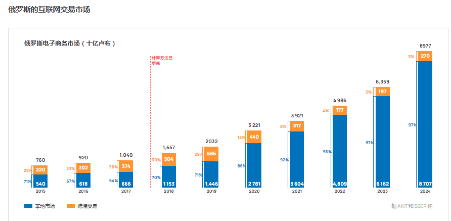2024年俄罗斯电子商务市场已高达8707(10亿卢布)。