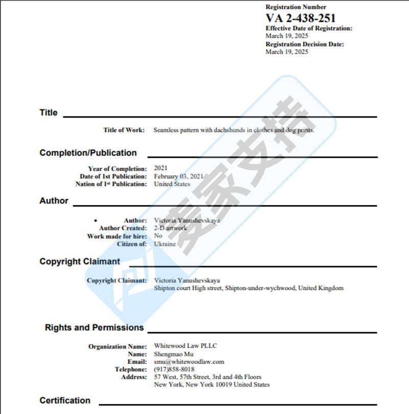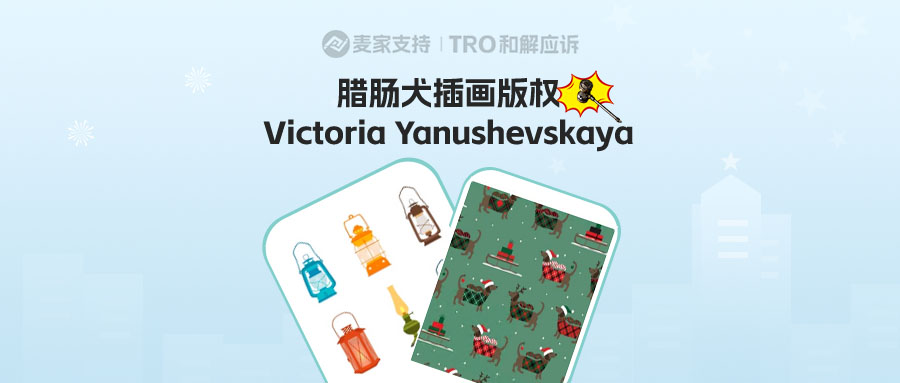 本案是Whitewood律所代理Victoria Yanushevskaya,于7月25日在伊利诺伊州发起的版权维权,涉案作品为一幅于2025年3月19日取得版权证书的身穿衣服的腊肠犬的版权图作品,版权号为:VA0002438251。其实本案并非原告的首次维权,早在7月初,Whitewood 就代理其在宾夕法尼亚州发起过一次维权,共有184店涉案,但由于管辖权原因,该案件于7月17日被法院驳回了初步禁令申请,案件戛然而止,进而于7月25日改到伊利诺伊州重新发起!目前该案件处于密封状态,涉案版权图暂未公布,但麦家支持通过原告作品排查到了几幅相关作品供卖家避雷!