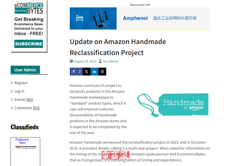 8月11日消息,亚马逊正推进其针对手工类产品重新分类,将手工制品从原有的“GUILD”产品类型转为“标准”产品类型,以期提升在亚马逊商城中的可发现性。该项目自2023年启动,2024年10月公布了详细信息,被定义为一项多年计划,预计将在今年年底前完成。目前,亚马逊在项目推进过程中会向卖家发送通知,说明时间安排及具体要求。