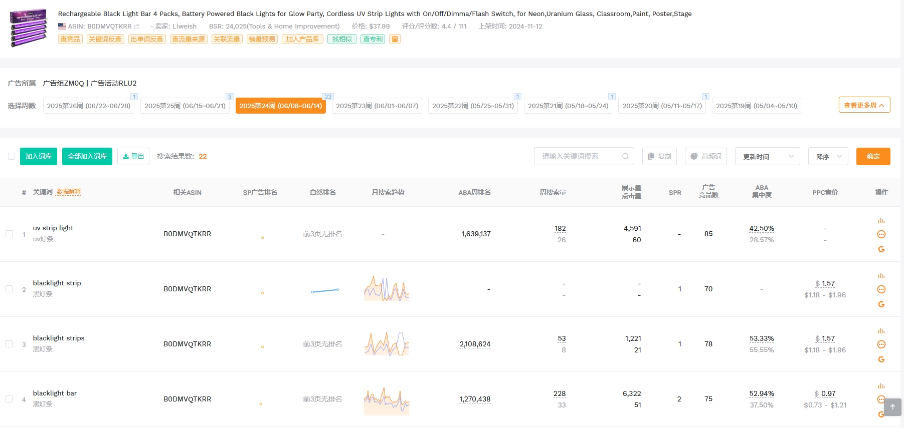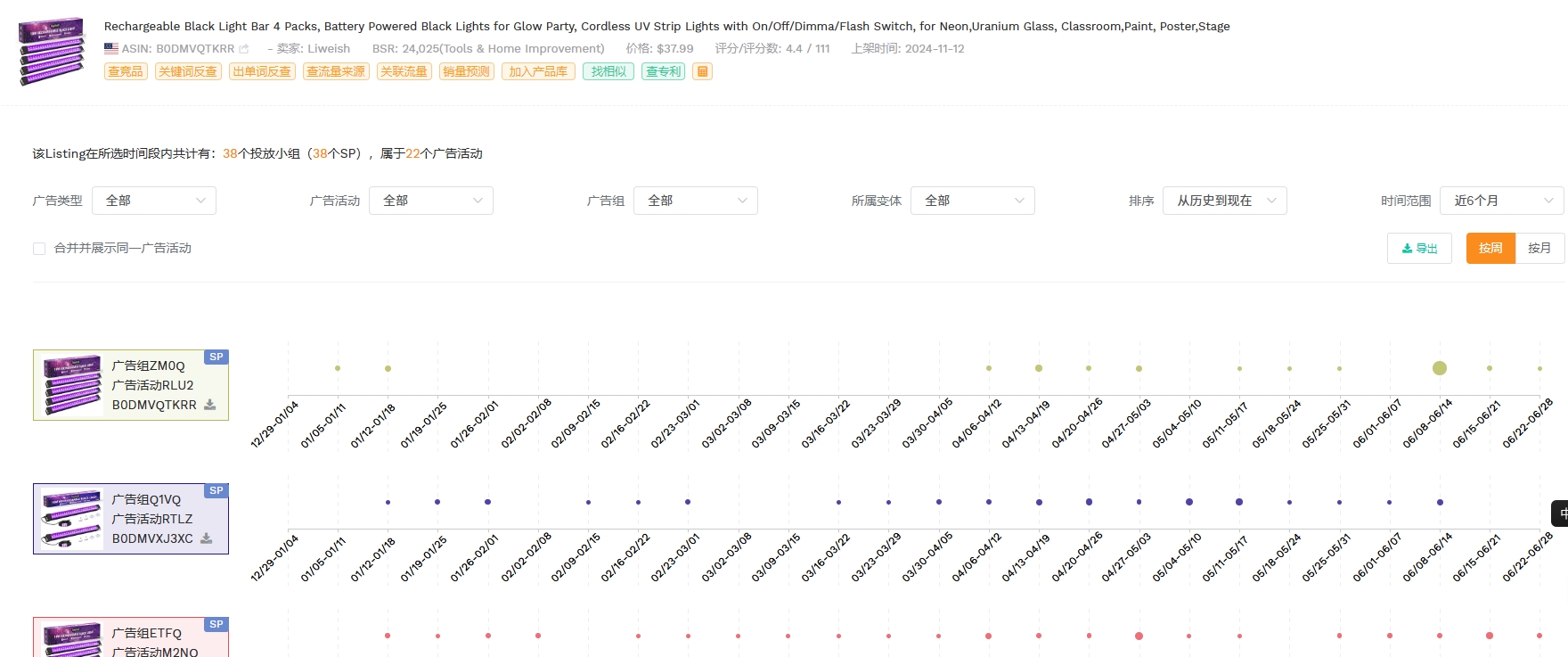 通过广告洞察可知该产品及所有变体共有:22个广告活动、 38个广告组(仅包含关键词广告,不包含ASIN投放),当一个广告组投放多个变体时,会将一个变体分为一个组,所以会出现广告组多于后台的情况。趋势中同一颜色的广告组属于同一广告活动。