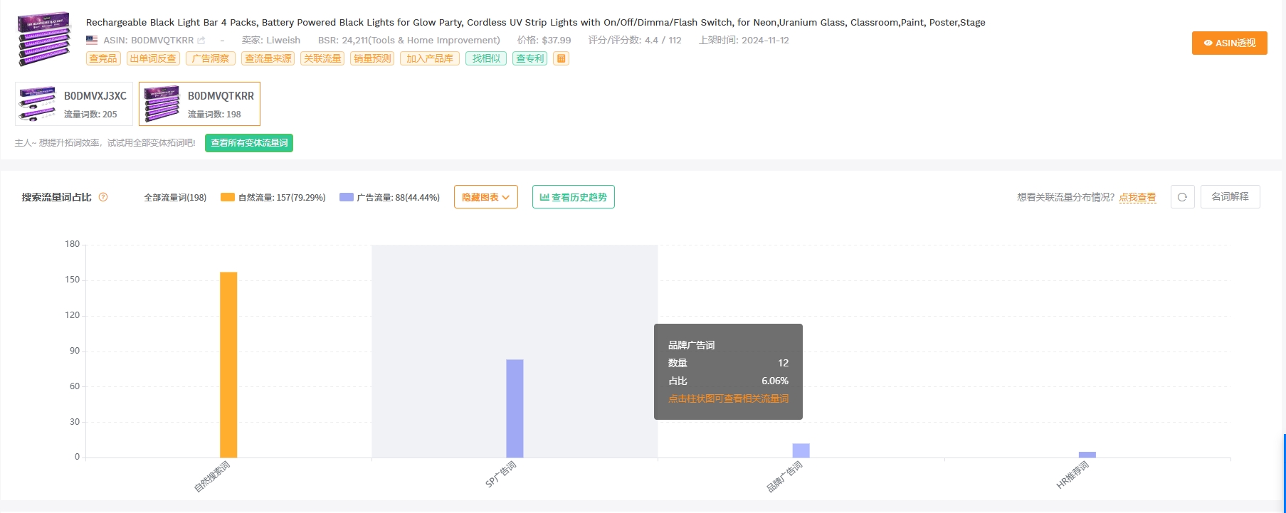 我们利用卖家精灵的关键词反查功能,只要输入产品的ASIN,就可以查到产品的搜索流量占比和关键词,包括自然搜索词和广告词,自然出单关键词也是自然搜索词。