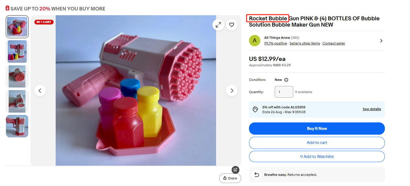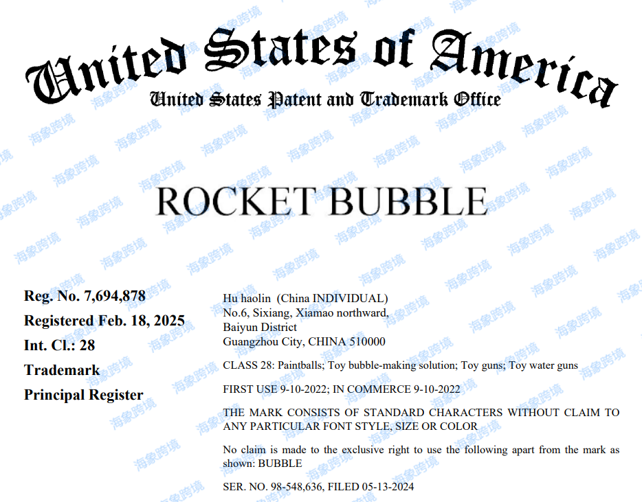 案件参数 起诉时间:2025/6/30 案件号:25-cv-878 原告品牌:ROCKET BUBBLE 泡泡机 品牌方:HU HAOLIN 起诉地:美国宾夕法尼亚州 注册商标: 本案为国人原告,案件涉及商标如下,主要注册在第28类:彩弹;玩具泡泡液;玩具枪;玩具水枪。被告众多,相关卖家注意查看并下架! 刊登实例: