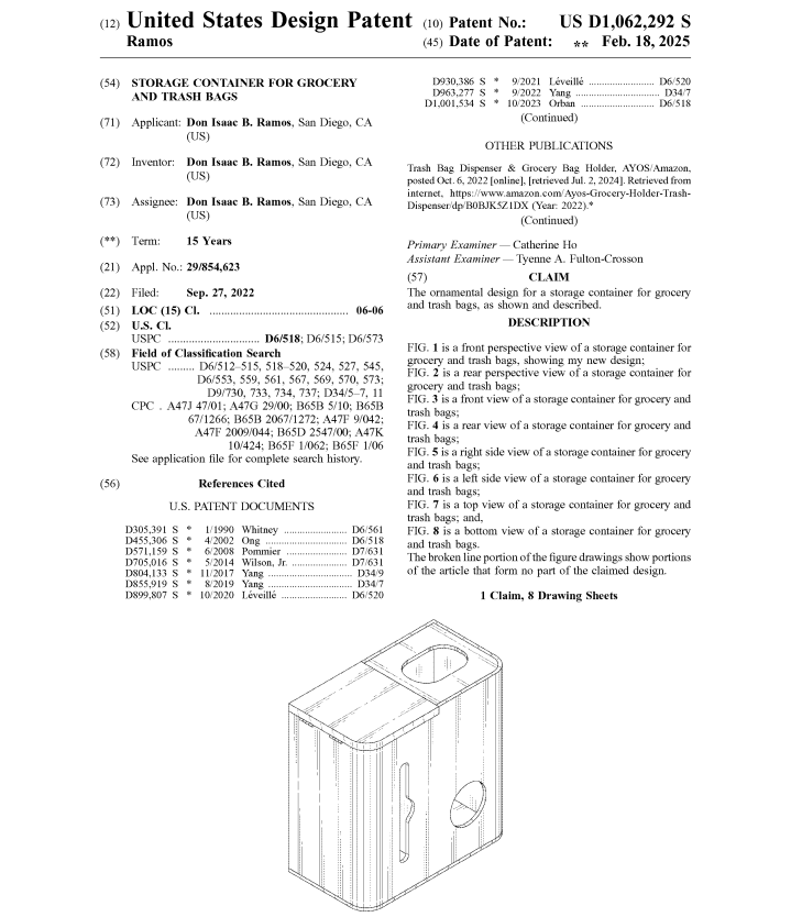 专利名称Storage container for grocery and trash bags,专利号USD1062292S,2022年9月27日申请,2025年2月18日下证: