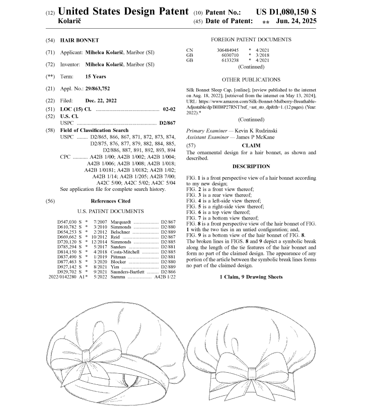 主要涉及名为HAIR BONNET的美国外观专利,专利号USD1080150S,2022年12月22日申请,2025年6月24日下证: