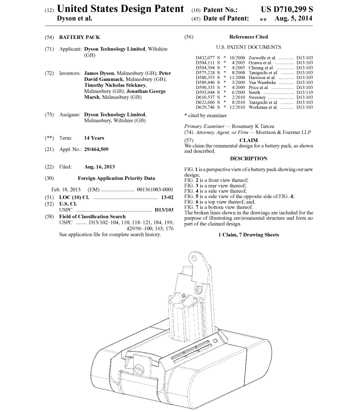 专利名称Battery pack,专利号USD710299S,2013年8月16日申请,2014年8月5日下证: