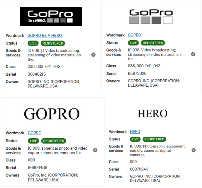 GoPro的文字商标及图形商标都不可擅用,均注册在多个类目,此外还要格外留意文字商标HERO: