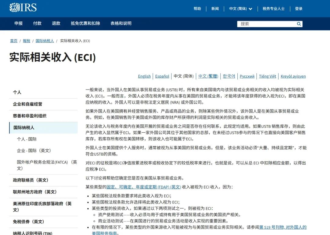 根据美国国税局(IRS)的定义:如果一家外国公司在美国开展了“贸易或业务”(USTB),相关收入将被视为EffectivelyConnectedIncome(ECI,有效关联收入),需要申报美国联邦所得税。