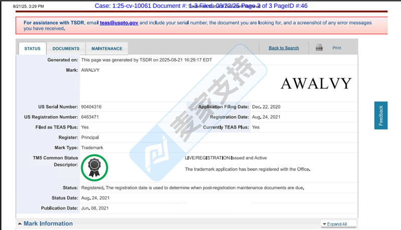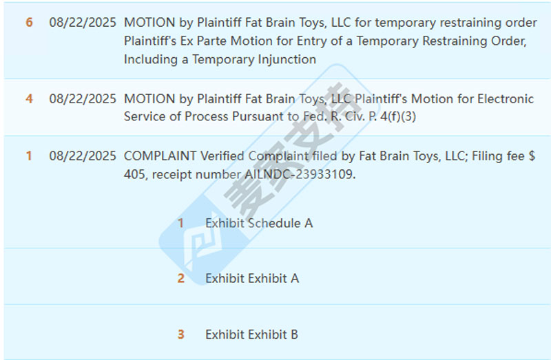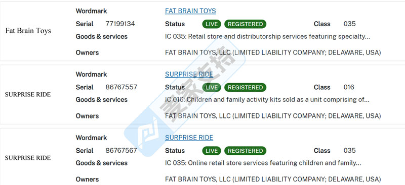 本案是Saul Ewing Arnstein & Lehr LLP代理Fat Brain Toys, LLC 发起的关于AIR TOOBZ商标维权案件,案件主要针对4名未经授权销售与原告产品包装设计、零部件、功能操作相似的侵权行为!除此之外,麦家支持通过检索发现,该原告在美国还注册有三个商标,涵盖:Fat Brain Toys以及SURPRISE RIDE商标等,任何未经授权使用的行为,均会面临TRO冻结风险,跨境卖家应注意避雷!