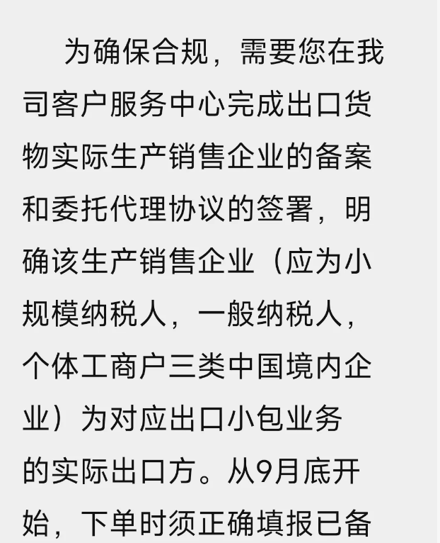 同时,还有部分货代企业发布相关公告,要求卖家在下单前需完成出口货物实际生产销售企业的备案和委托代理协议的签署,明确该生产销售企业为对应出口小包业务的实际出口方,以确保合规,避免影响出口业务的通关流程。