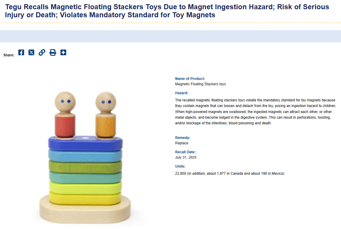美国消费品安全委员会(CPSC)宣布召回2万多件磁浮堆叠玩具,原因是该玩具违反玩具磁铁强制标准,玩具磁铁存在松动脱落风险,可能被儿童误食,导致其在消化道内卡滞,可能引发肠穿孔、肠扭转、阻塞,甚至是败血症、死亡等严重后果。