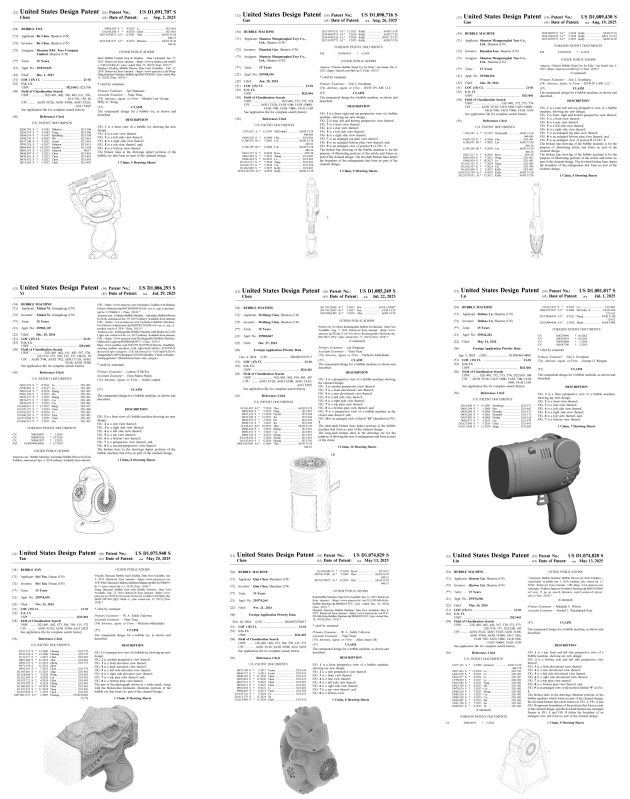 除上述产品外,泡泡玩具的美国外观专利还有很多,以下仅是检索到的今年下证的少部分产品,若您有销售此类产品,务必做好专利侵权排查,不然极易踩雷: