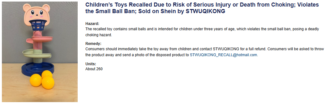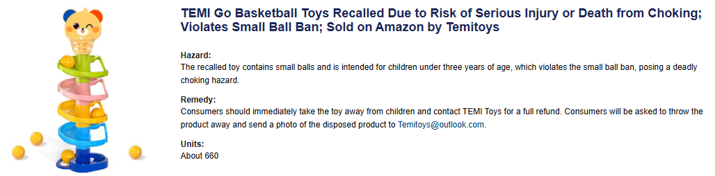 儿童玩具品类首当其冲,由于是面向脆弱敏感的儿童群体,儿童玩具类产品合规问题一向备受重视,不合规不仅会被亚马逊下架封号,若是出现安全问题,还将面临面临召回、退款、下架、赔偿等惨痛后果,近期就有不少玩具产品被强制召回: