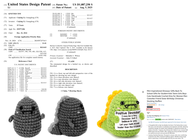 针织玩具外观造型是一大买点,这也就意味外观专利不会少,比如以下这款在亚马逊上月销600+的恐龙造型针织玩具,在今年8月5日已获得专利授权,专利名称Knitted toy,专利号USD1087250S,2024年12月10日申请: