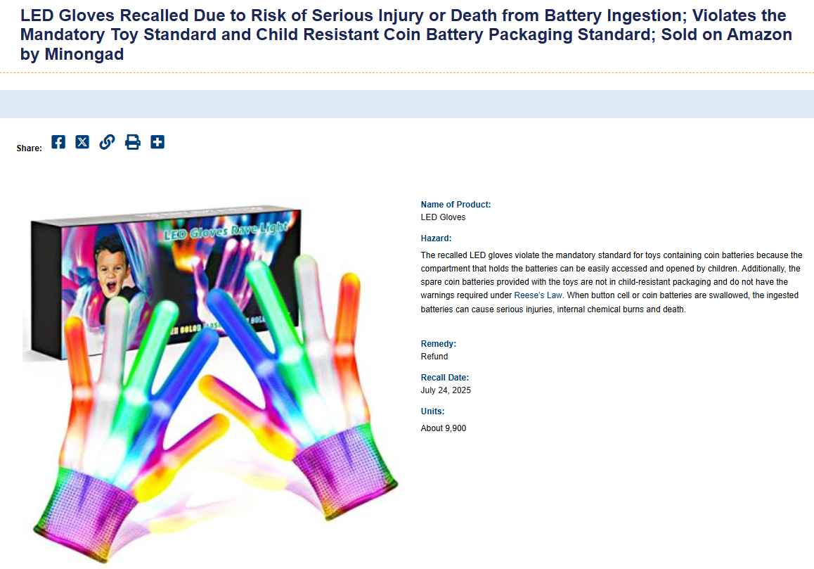 CPSC宣布召回9900件LED发光手套,原因是该产品不符合含纽扣电池玩具的强制标准,存在安全隐患,电池仓设计存在明显缺陷,儿童能轻易打开且随时取用。更严重的是,随附的备用纽扣电池既未采用儿童防护包装,也未标注《里斯法案》要求的警示标识。若误食纽扣电池或纽扣电池,可能导致严重伤害、体内化学灼伤甚至致命后果。