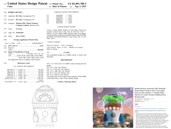 热销背后往往藏有侵权风险,泡泡玩具也不例外。9月2日就有一件月销300+的产品专利下证,专利名称Bubble rocket,专利号USD1091708S,2024年6月9日申请: