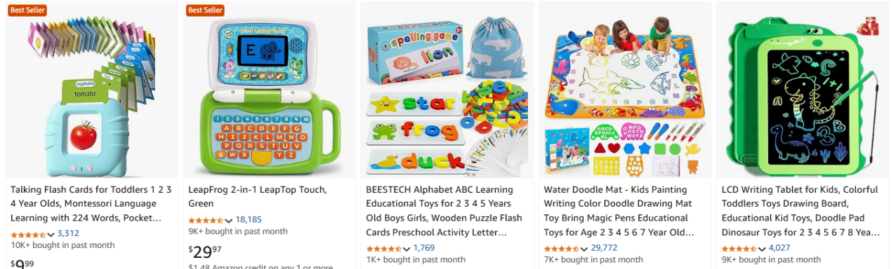 益智玩具可以帮助孩子开发智力,改善逻辑思维,刺激感官发育,是不少家庭会选择的玩具产品。亚马逊相关listing多达10W+,不少产品月销过千。