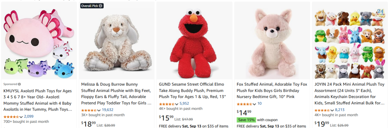 毛绒玩具在亚马逊上有10W+相关listing在售,其中不仅出了Squishmallows、TeeTurtle翻面章鱼等爆款,留评月销双双过千的产品也不在少数。