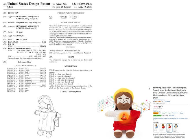 不少毛绒玩具都已申请专利,比如以下这款十分适合圣诞送礼的耶稣造型玩具,专利名称Plush toy,专利号USD1089456S1,2024年12月17日申请,2024年8月19日下证: