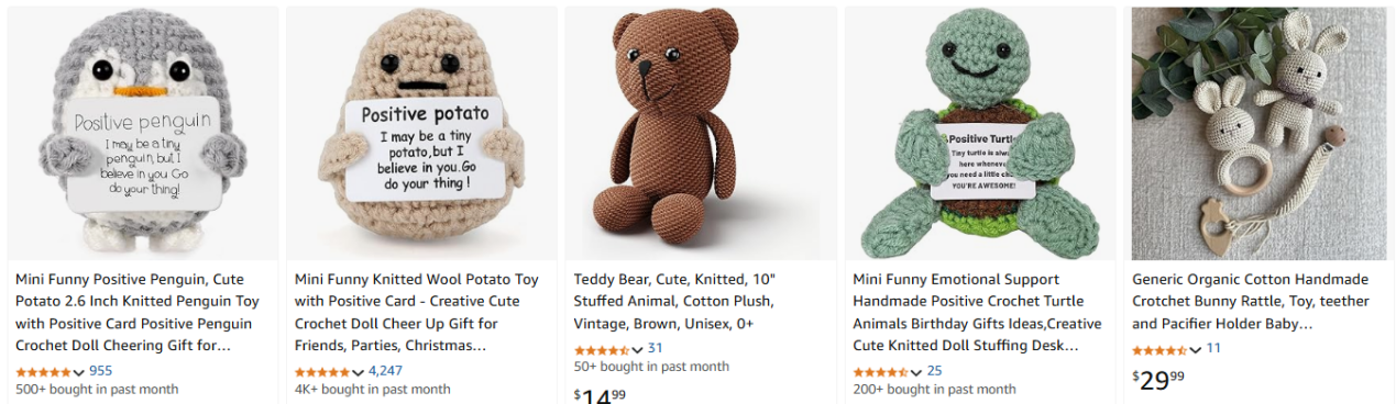 针织玩具不仅可爱,还兼具实用性和情感价值,无论是自用、送人还是装饰家居,都能带来独特的温馨感,亚马逊上各种款式产品都颇受欢迎。