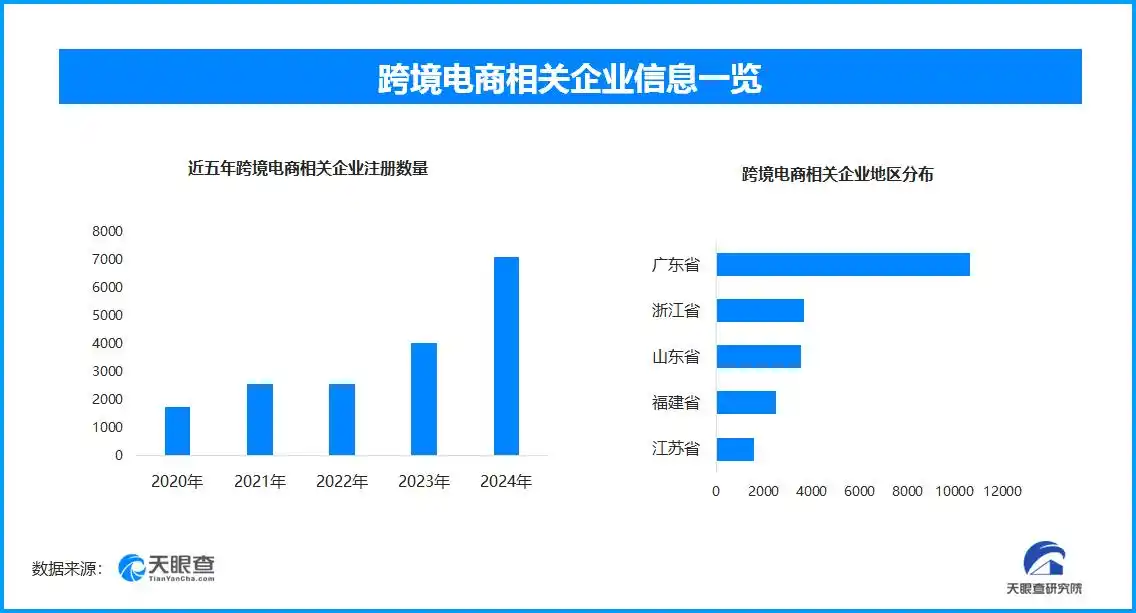 天眼查数据显示,现存跨境电商相关企业3.3万余家,2025年1月到现在新增注册相关企业1万余家,与2024年同期相比增长194.1%。