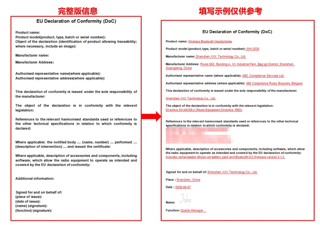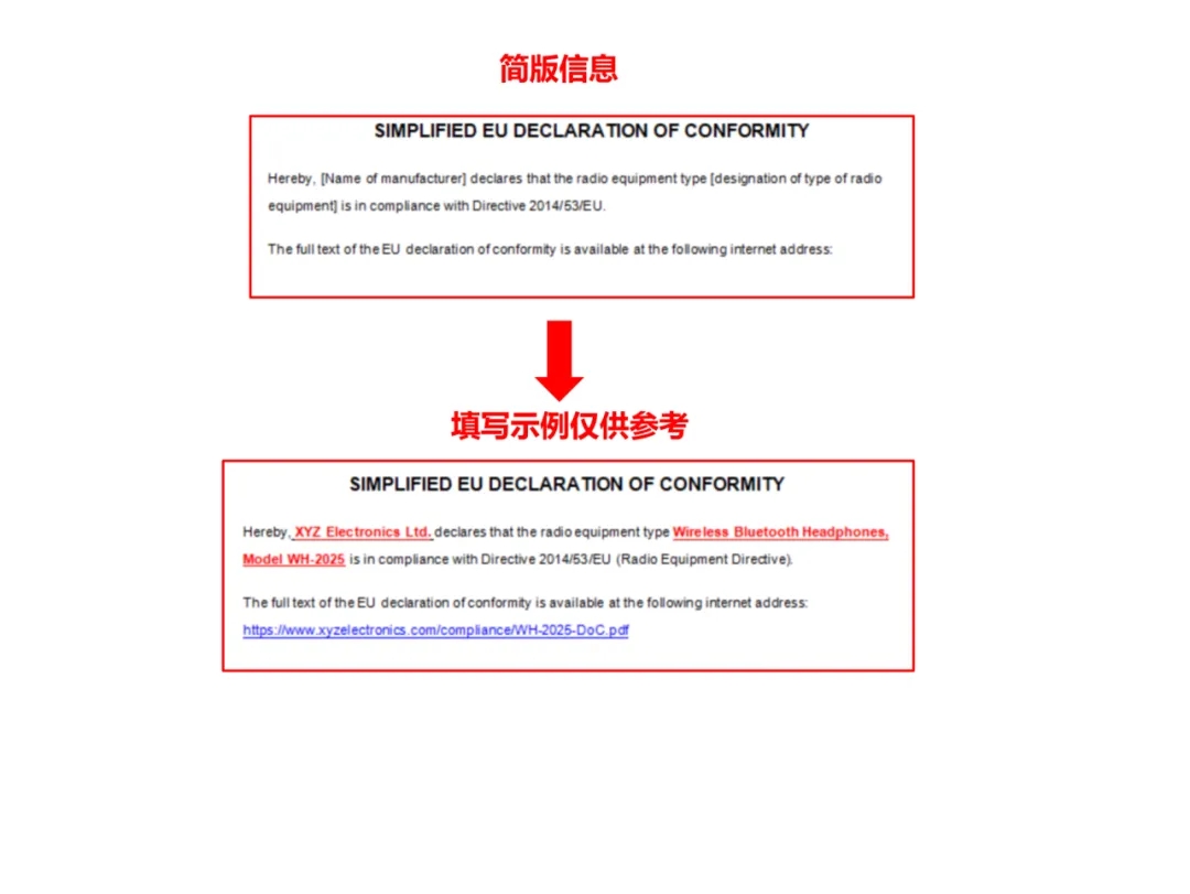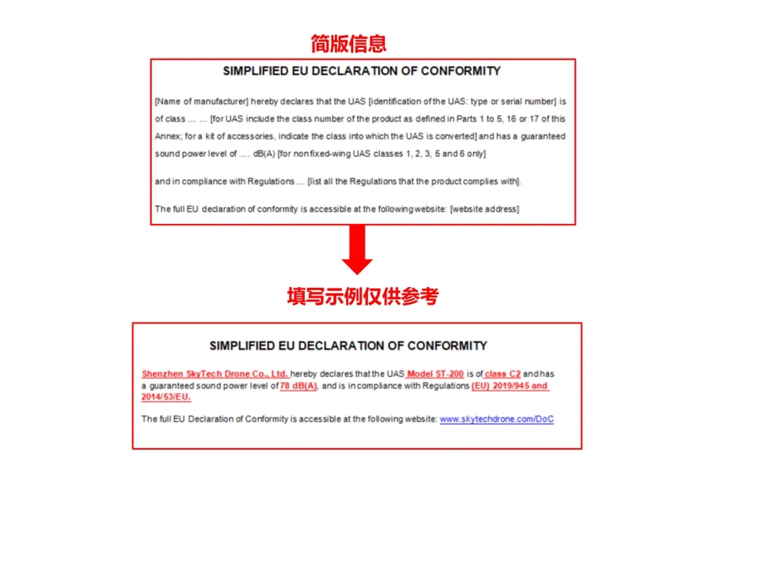 根据欧盟协调法规要求,制造商有义务在将产品投放市场前起草并签署《欧盟符合性声明》。《欧盟符合性声明》是一份文件,用于声明产品符合适用法规的所有相关要求。另外,部分商品应随附提供纸质版本的符合性声明,如无线电设备、无人机商品等。 卖家在向欧盟市场销售商品前,应根据商品的具体特性,确保其符合所有适用的欧盟法规。以下为部分常见法规及对应产品的符合性声明要求: 无线电设备Radio Equipment (RED) 符合性声明文件合规要求参考Directive 2014/53/EU 机械设备Machinery (MD) 符合性声明文件合规要求参考Directive 2006/42/EC 无人机Unmanned aircraft systems (UAS) 符合性声明文件合规要求参考Regulation (EU) 2019/945 个人防护设备Personal protective equipment (PPE) 符合性声明文件合规要求参考Regulation (EU) 2016/425 燃气器具Gas appliances (GAR)符合性声明文件合规要求参考Regulation (EU) 2016/426 测量仪器Measuring instruments (MID)符合性声明文件合规要求参考Directive 2014/32/EU 建筑产品Construction products (CPD/CPR)符合性声明文件合规要求参考 Regulation (EU) No 305/2011 **以上列举仅供参考,并未涵盖所有相关的法规。请卖家根据所售产品的实际情况,确保商品符合相关法律法规的最新要求。 (一)基本要求 根据欧盟无线电设备指令和无人机法规,对于适用范围内的商品,欧盟符合性声明(DoC)可采用完整版或简化版两种形式。请注意: 1. 符合性声明的语言应满足销售目的国家/地区的要求; 2. 如果随附商品提供简化版符合性声明,则应包含可获取完整版欧盟符合性声明全文的网址; 3. 符合性声明的内容应该与相关资质文件上的共有信息保持一致。 (二)具体示例 以下示例涵盖无线电指令(RED)、无人机法规(UAS)的完整版与简化版文字模板要求,供卖家参考。 提示:以下文字模板和图片示例均为示范用途,非真实信息。应根据实际商品情况准确填写,并确保上传的文件真实、完整且符合法规要求。 1.无线电指令 2. 无人机法规 根据销售目的国/地区的官方语言要求确定。