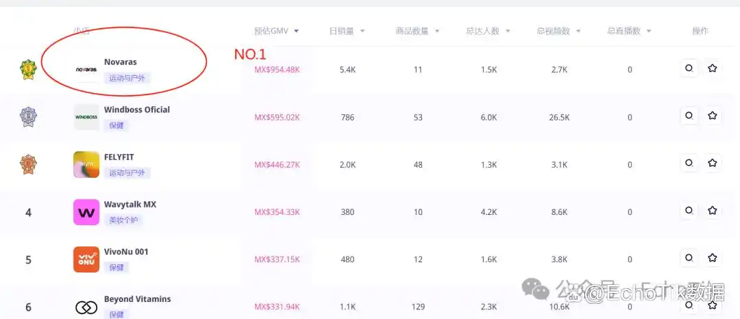 如果说拉美市场是 “沃土”,那么 Novaras 就是这片土地上长势最猛的 “作物”。从最新店铺数据来看,本周墨西哥电商前十店铺总 GMV 达 4218 万墨西哥比索(约合 1560 万人民币),其中运动与户外分类贡献了 1717 万墨西哥比索,占比高达 40.71%—— 而 Novaras 不仅稳居运动品类榜首,更以超出第二名 Windboss Oficial 361 万墨西哥比索的优势,成为当之无愧的 “品类霸主”。